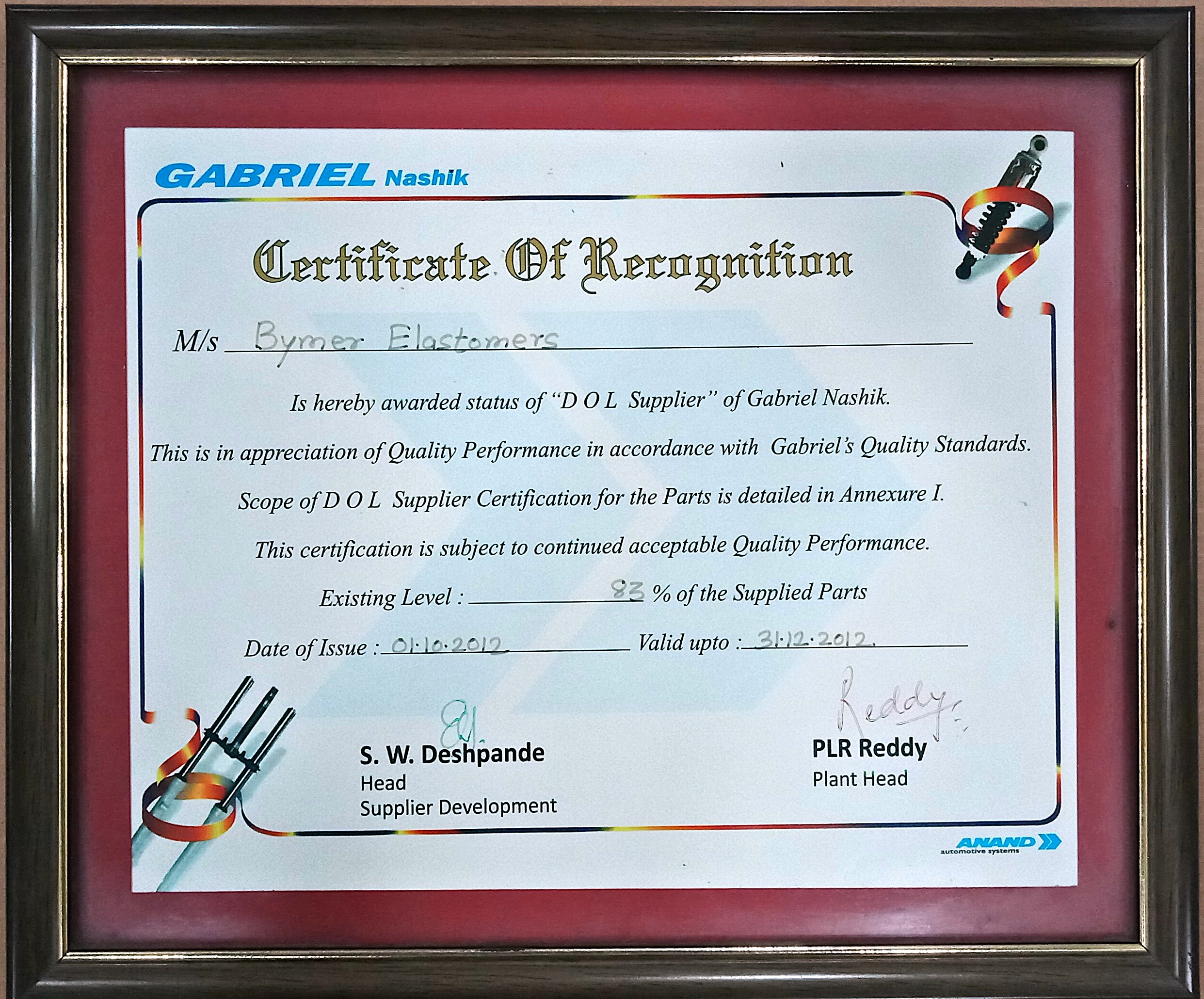 Certificate of Recognition from Gabriel India Ltd., Nashik