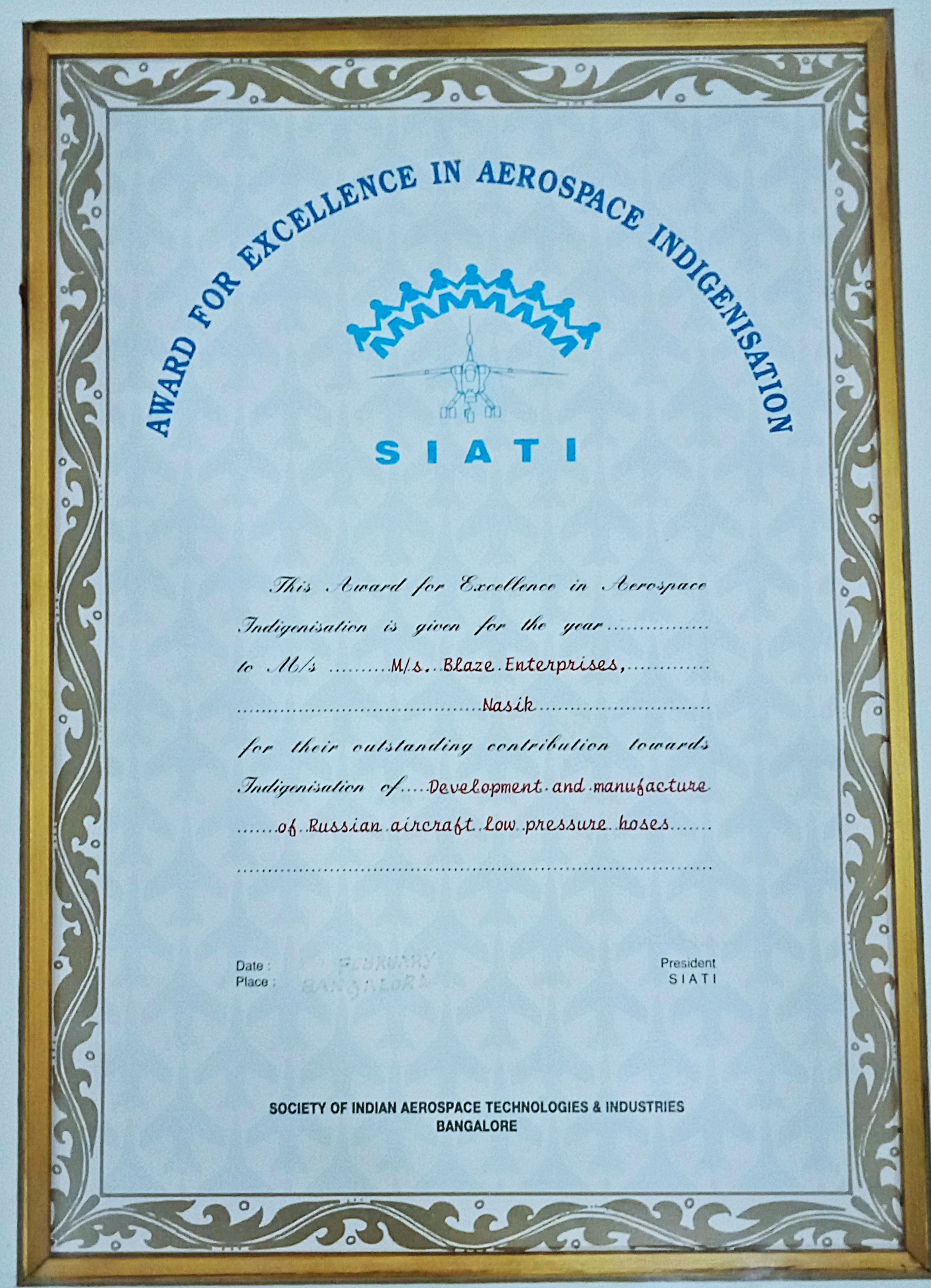 Award for Excellence in Aerospace Indigenisation by SIATI